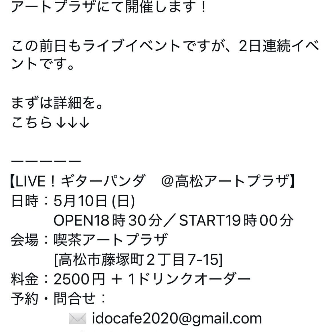 ライブの詳細、ご予約はアートプラザさんのSNSにてご確認下さい。